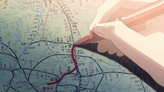 주인공이 있는 신주쿠 근처에서 여주인공이 살고 있는 곳까지는 열차를 3번 갈아타고 3시간 가량을 가야 되는 먼 여정입니다. 옛날 2001년 일본 여행할때에도 저런 책자를 펼쳐 놓고 봤던 기억이 있는데 이시점에 그장면을 다시보니 참 기분이 묘합니다. 요즘 젊은 분들은 이런 기분을 아실지 모르겠습니다. 역시 아날로그 감성.