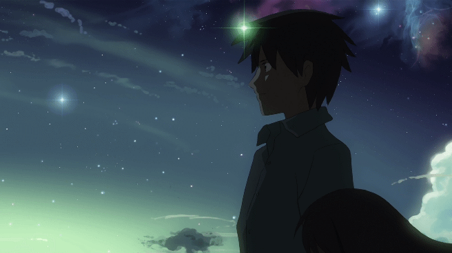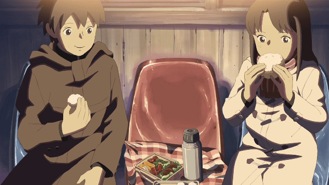 약속을 정한날 밤 7시에 역에서 만나기로하고 남자주인공은 중학생으로서는 혼자서 최초로 4시간정도 되는 거리를 떠나게 됩니다. 여주인공을 위해서, 자신의 순정을 위해서 세계를 확장하게 되는거지요.