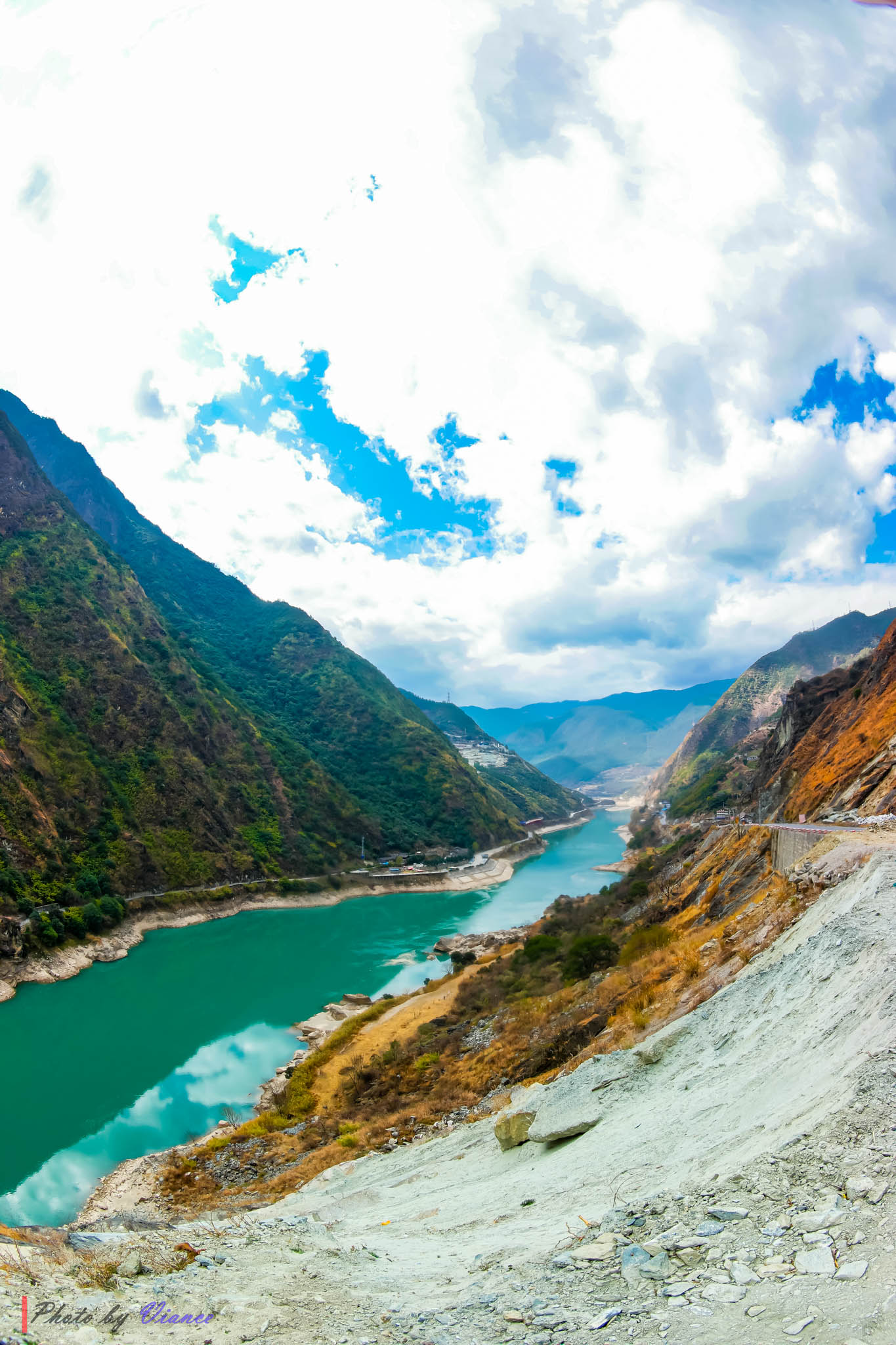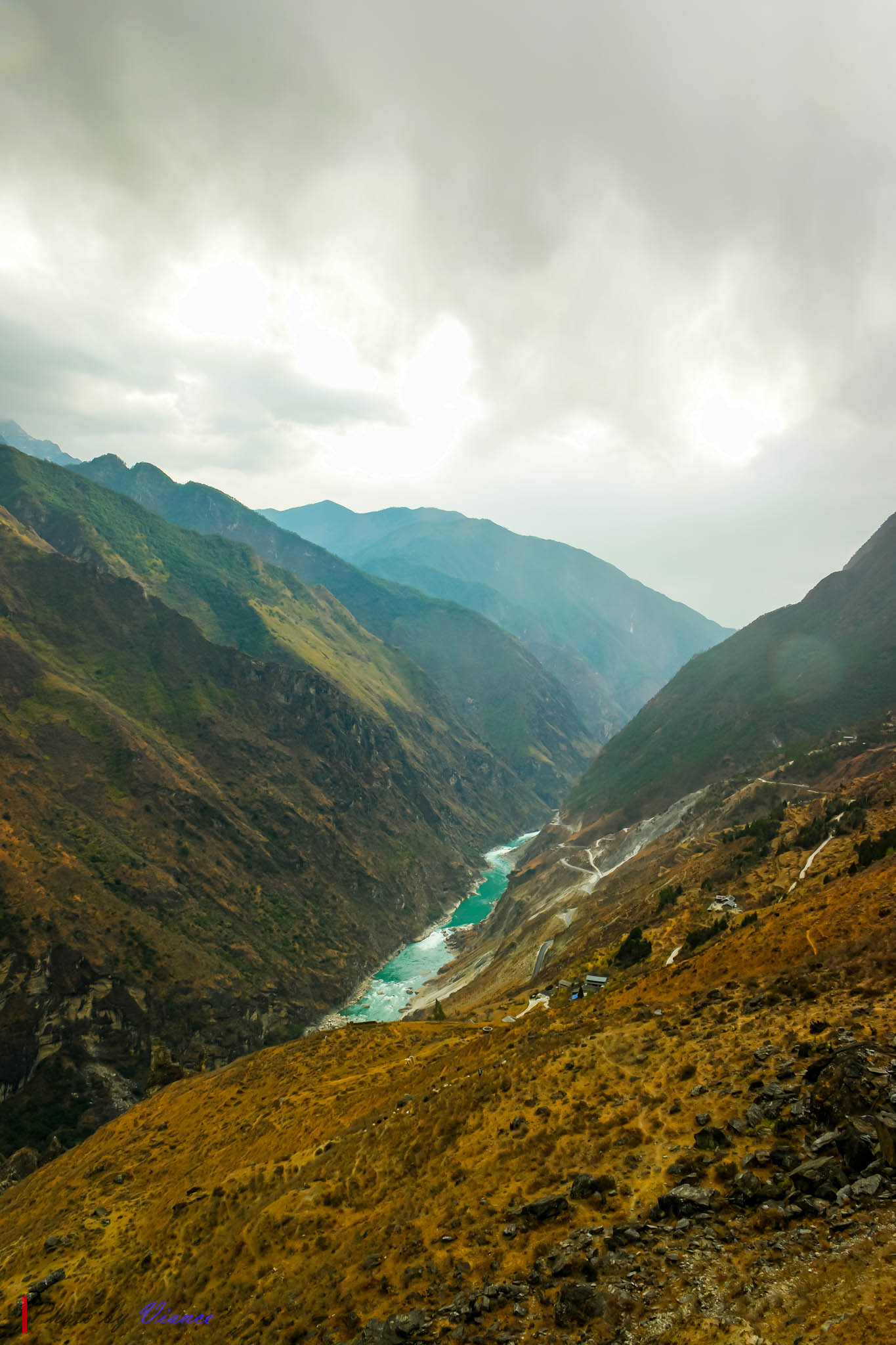 그 사이로 거대한 진사강(金沙江, Yangtze 상류)이 굽이쳐 흐른다.