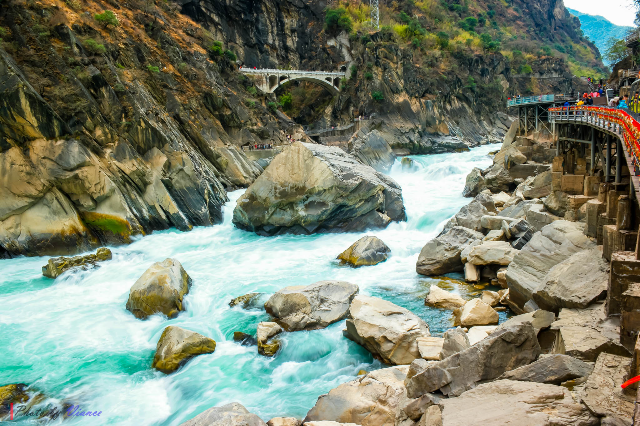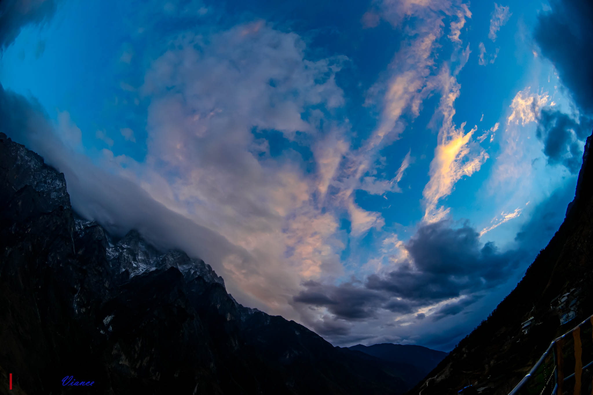 왼쪽에는 위룽설산(옥룡설산, 玉龙雪山, 5,596m), 오른쪽에는 하바설산(哈巴雪山, 5,396m)이 마주 서 있고,