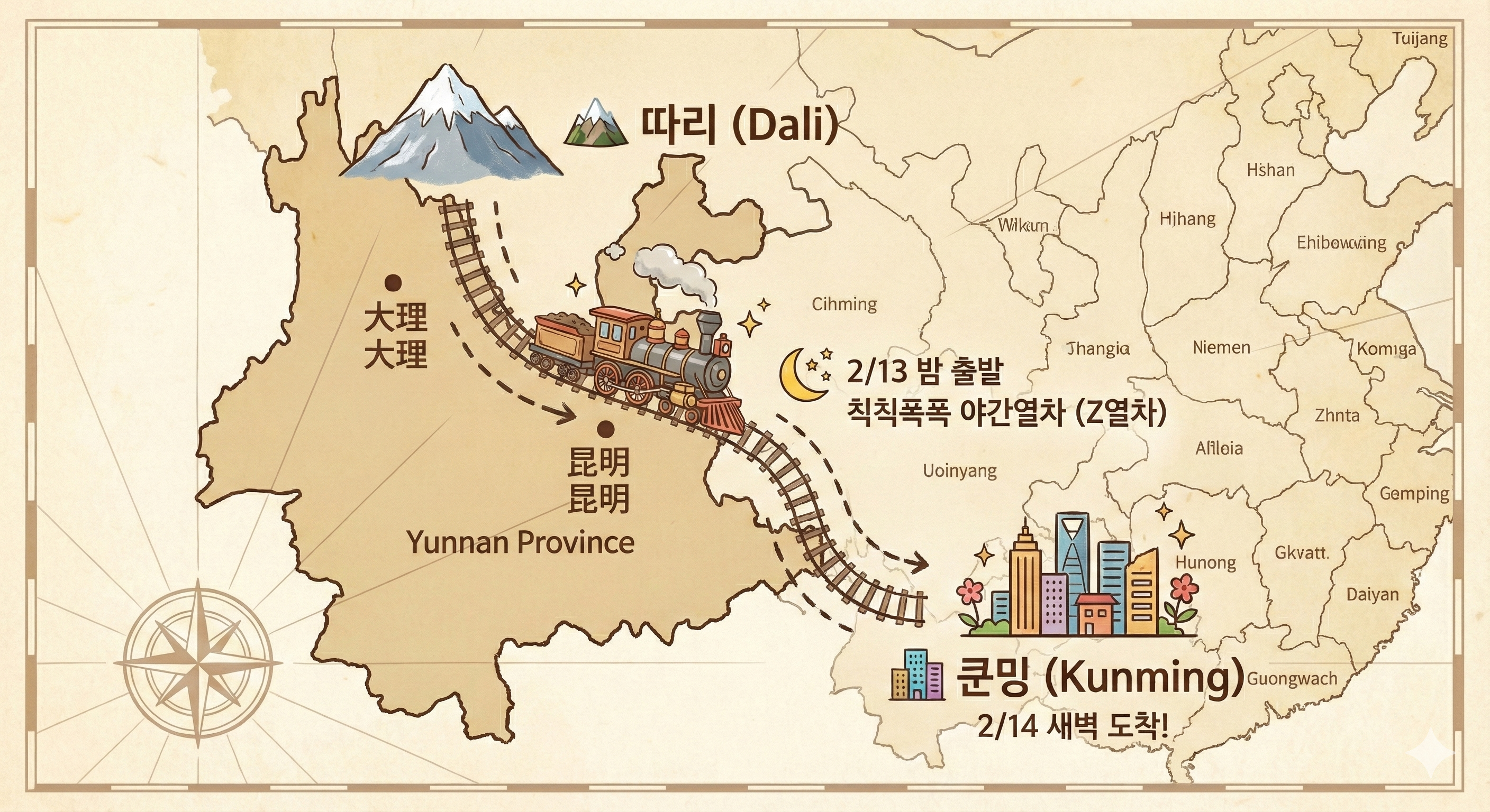 나는 친구와 함께 따리(大理)에서 쿤밍(昆明)까지 야간 열차로 이동했어.