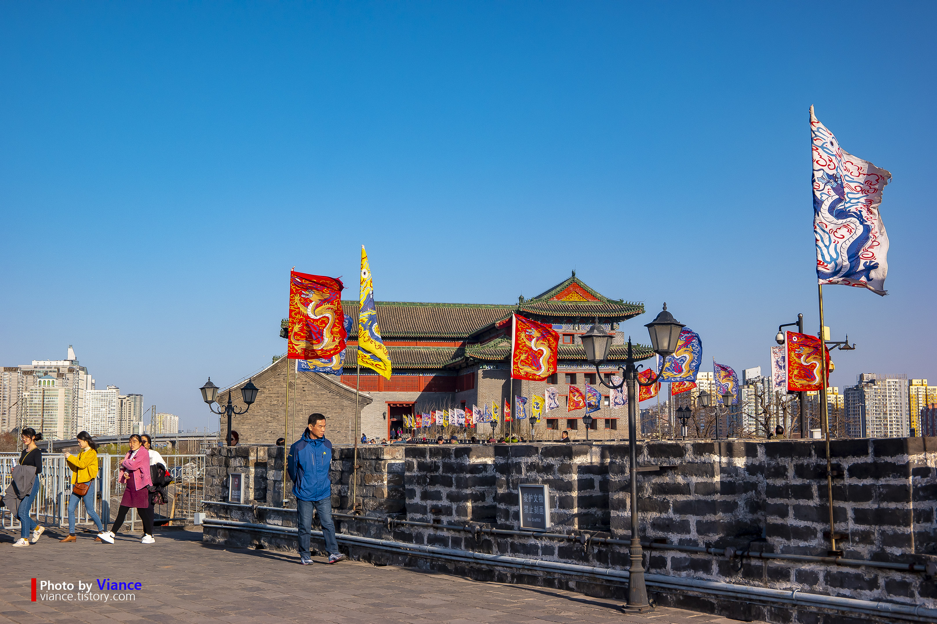 성벽이 제법 높아서 전망대 역할도 합니다. 베이징 시내의 스카이라인을 보며 사진을 남기는 사람들의 모습이 보입니다.