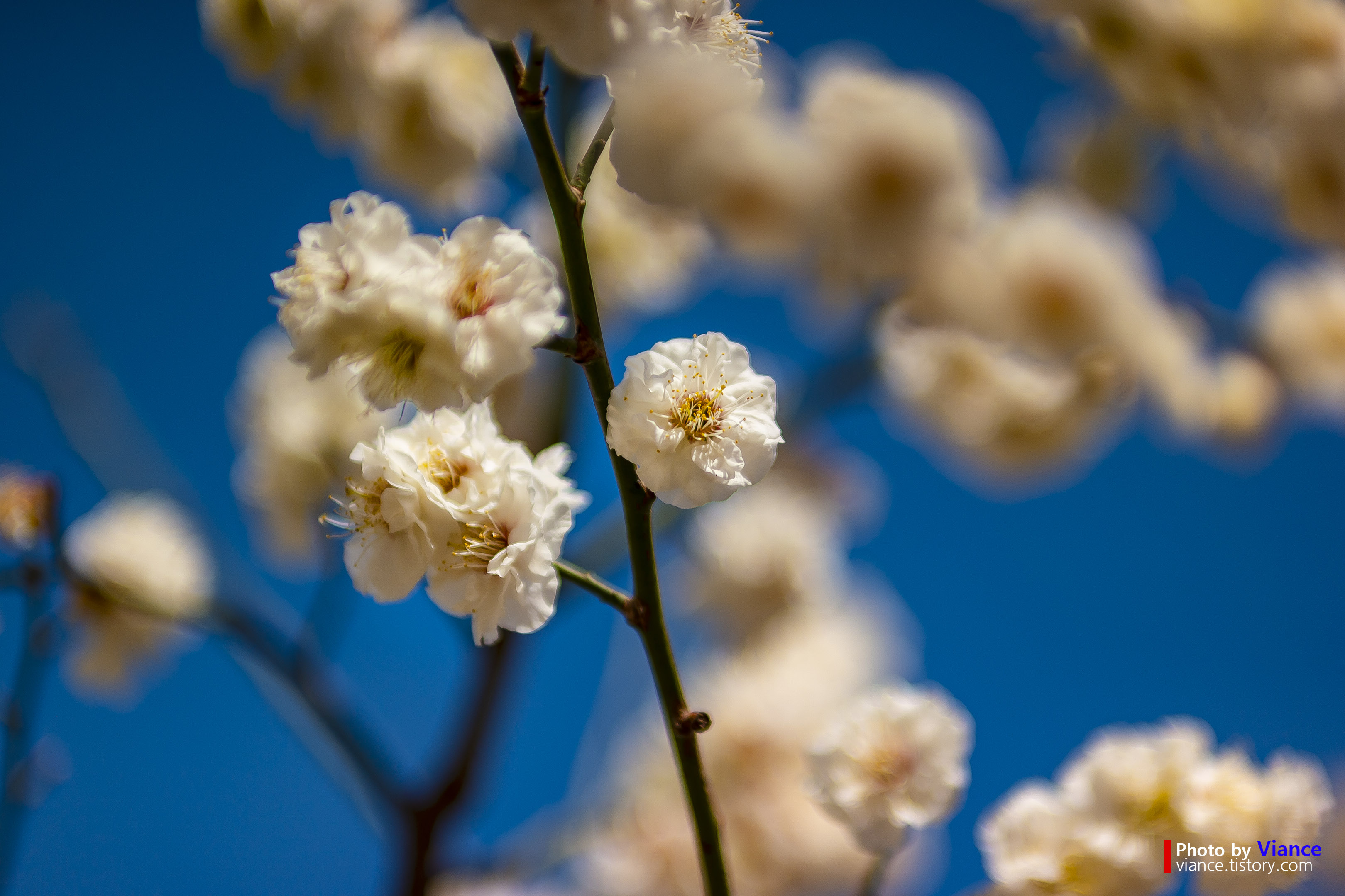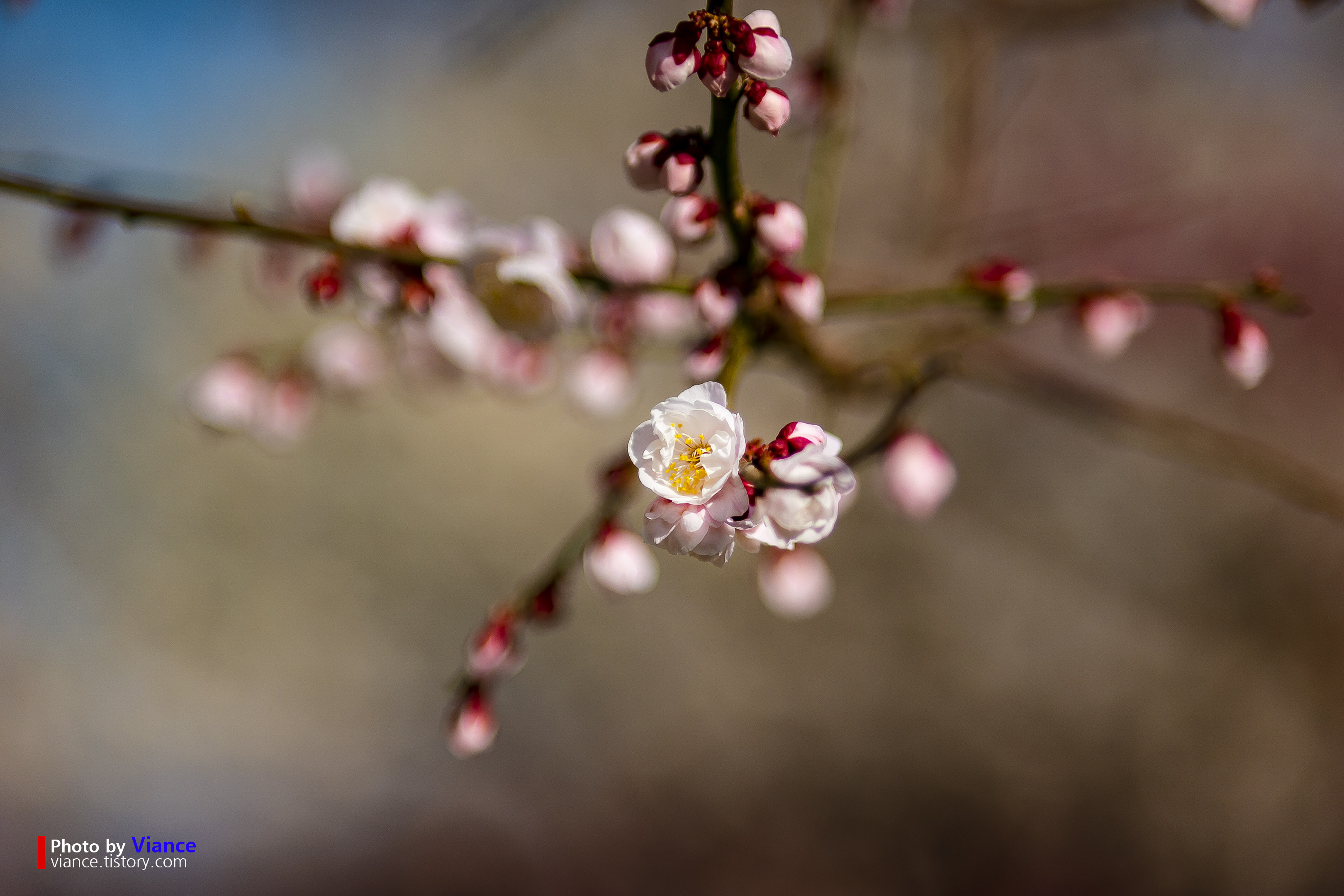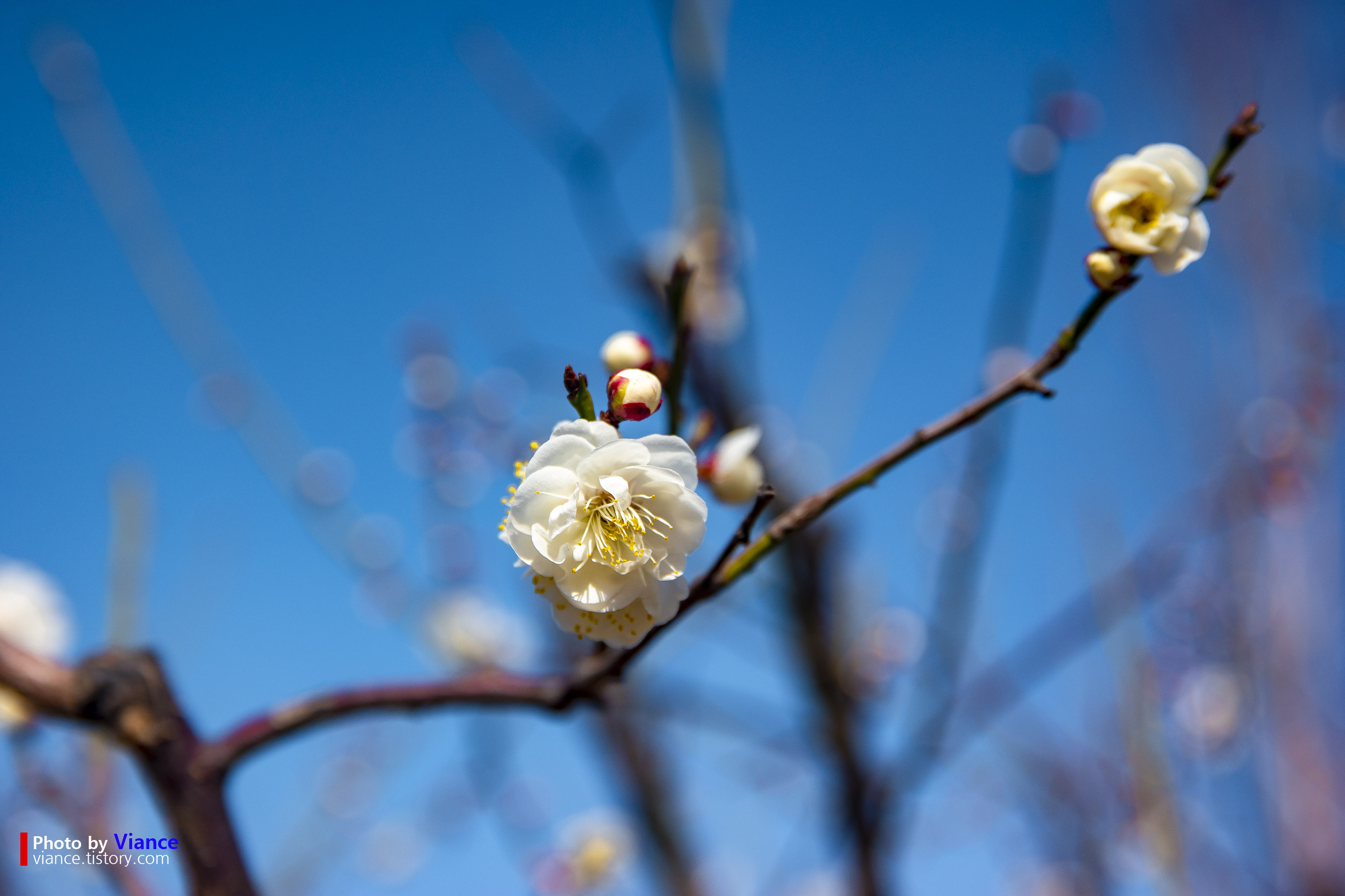 하얗게 만개한 매화 꽃은 물론 봉우리져 있는 매화꽃도 너무 아름다운데요. 파란 하늘을 배경으로 대비를 이루는 모습이 너무 아름다웠습니다.