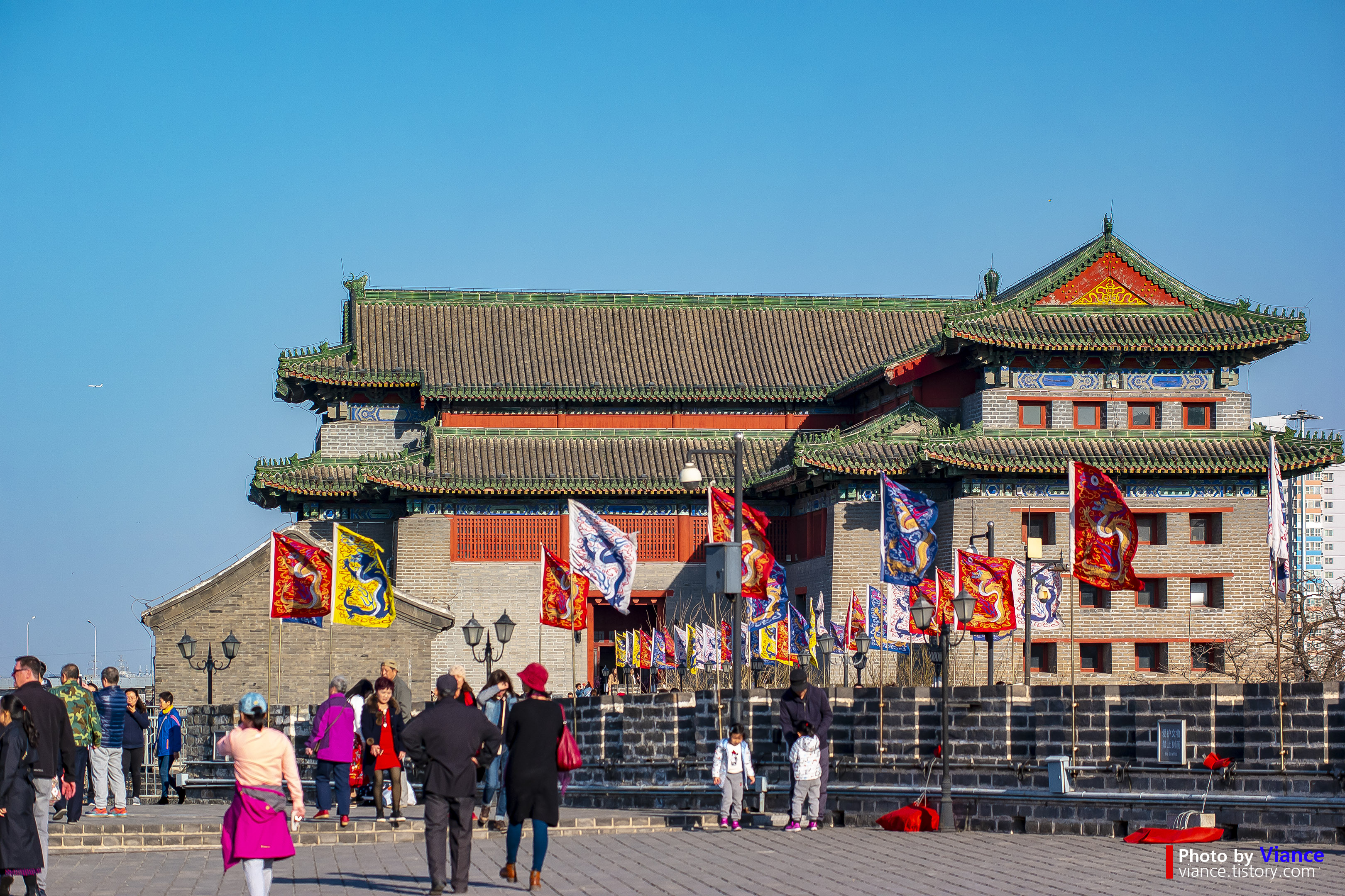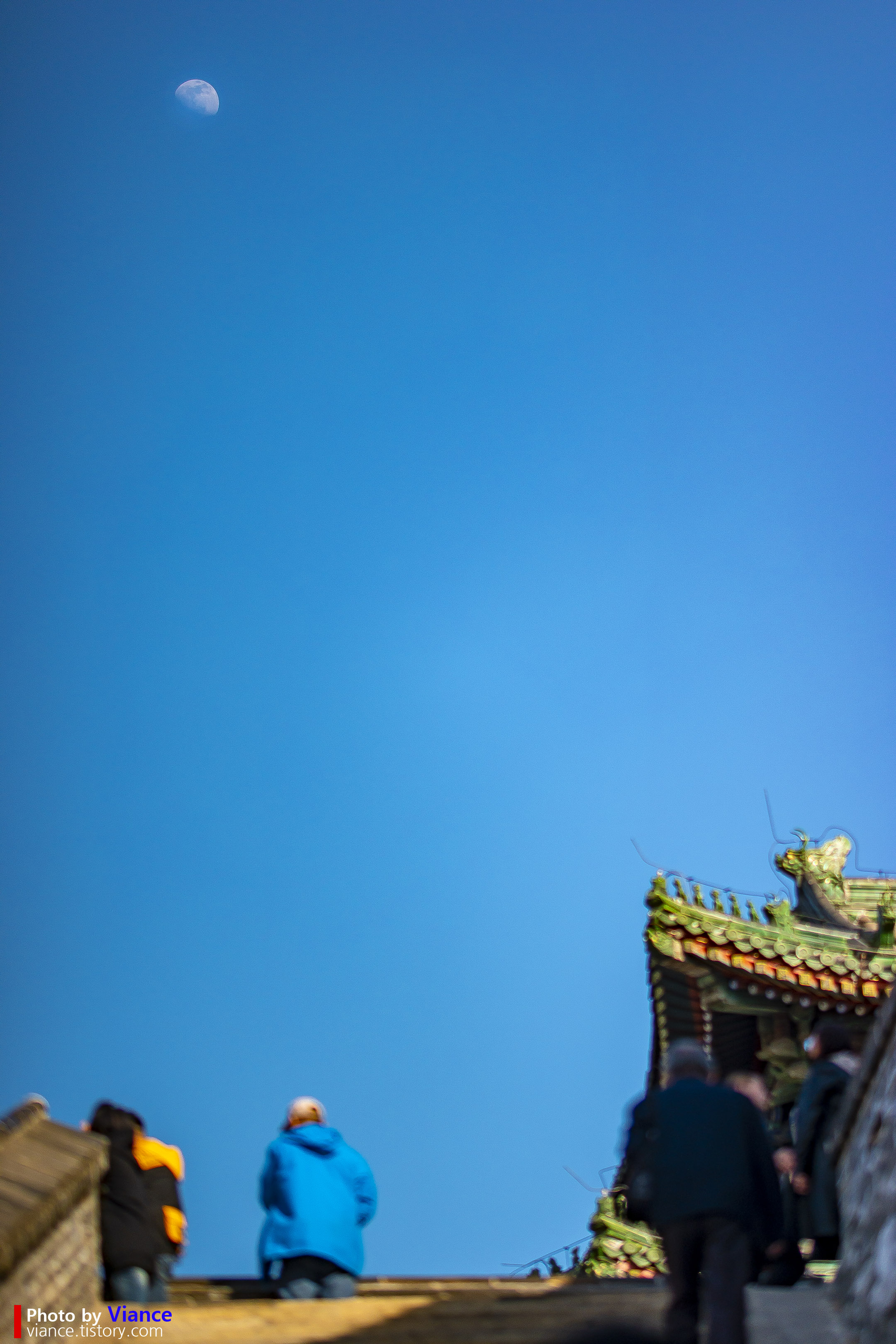 공원의 끝에는 명성벽의 동측 문으로 이어져 있고 그위에는 반도(선도)궁이 있습니다. 성벽위로 들어갈수는 있는데 인당 20원, 학생 10원에 들어갈 수 있습니다. 이날은 날이 너무 투명하고 맑아서 낮인데도 불구하고 달이 선명하게 하늘에 들어난 것을 알 수 있습니다.