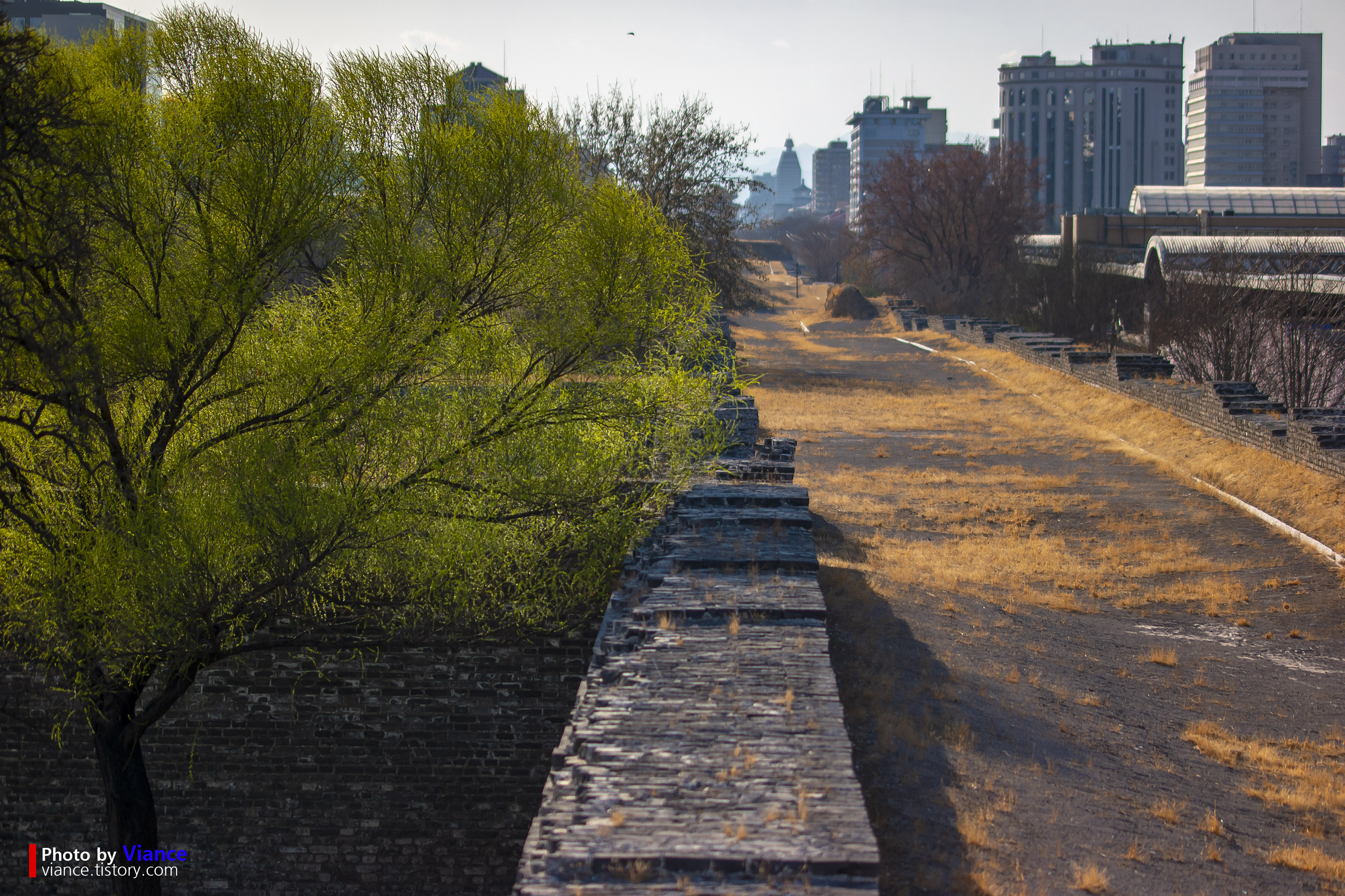 성벽위로 올라가보면 이렇게 과거 보병들이 근무를 다녔을 것으로 짐작되는 성곽 위에 길이 보입니다. 아쉽게도 개방이 되어 있지 않아 멀리서 찍어만 볼 수 있었는데 언젠가 복원이되어 성곽 위를 거닐며 베이징 시를 둘러볼 수 있었으면 합니다.